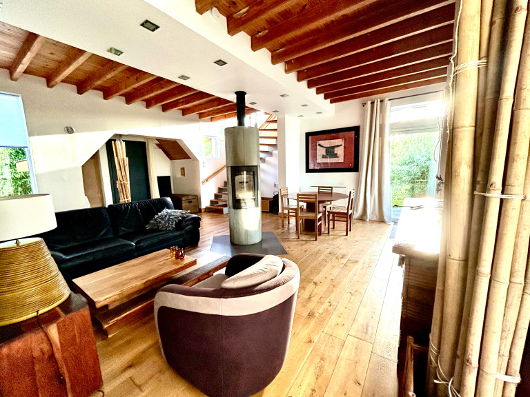 Pavillon individuel atypique érigé sur 500m² de terrain. Il a le charme d'un challet offrant calme et confort, on y trouve un poele à bois au coeur de la maison, salon parqueté, cuisine séparée équipée, 2 chambres, une grande salle d'eau. Terrasse, jardin et une allée pour stationner plusieurs voitures. Chauffage electrique et bois.
